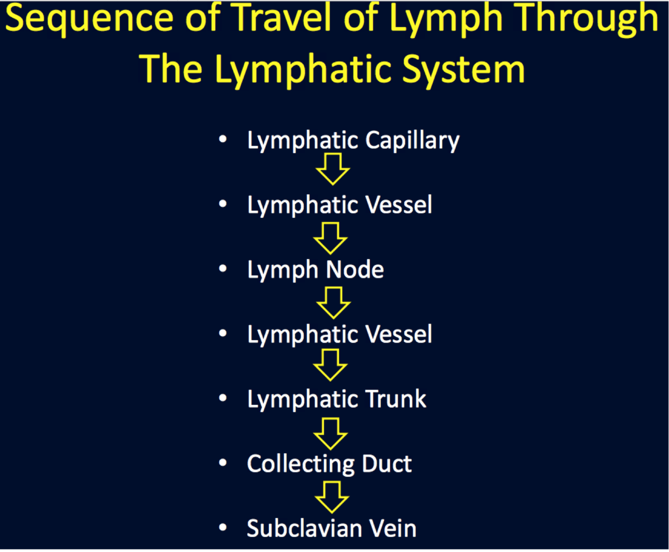 [*] Wide network of lymph channels: microscopic ‘blind’ lymphatic capillaries coalesce to produce larger lymphatic vessels (or lymphangions) => collecting trunks => unite to form ducts