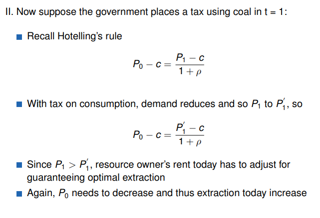 Using the hotelling rule, what happens if government plaxes a tax on using coal in t=1?