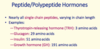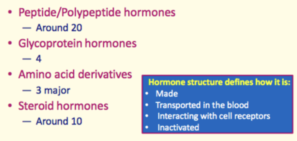 1) Peptide/polypeptide hormones 2) Glycoprotein hormones 3) Amino acid derivatives 4) Steroid hormones