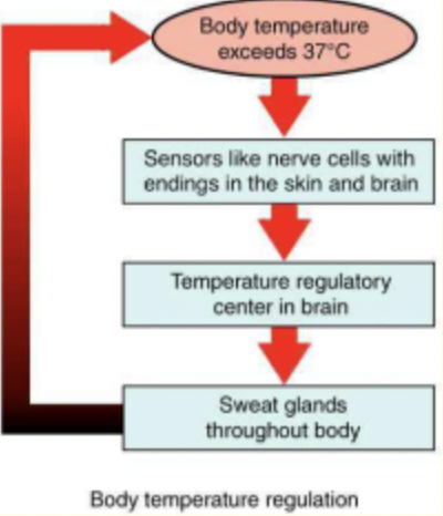 Thermoreceptors-hypothalamus-sweat glands = body temperature regulation