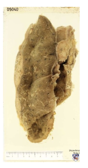 A 9-year-old child dies after an emergency visit to hospital with respiratory symptoms. His mum mentioned that he had many episodes of purulent sputum throughout his childhood. Pathology specimen of his lung shows the following findings.