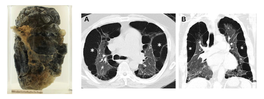 A 77-year-old heavy smoker with progressive breathlessness and weight loss presents to A&E. He has cor pulmonale and presents in respiratory failure. He dies shortly after admission. Pathology specimen of his lung and CT scan of his chest shows the following findings.