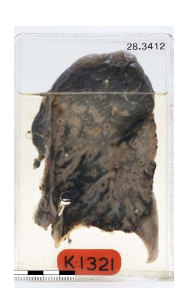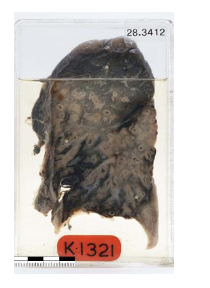 A 72-year-old lady, wife of a long-time shipyard worker complained of chest pain, breathlessness and accompanied by loss of weight. She died shortly afterwards and a post-mortem was carried out. Pathology specimen of her lung shows the following: