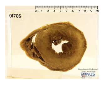 A 65-year-old man presents to A&E with shortness of breath and fatigue. He has poor adherence with his medications. Pathology specimen of his heart shows the following findings: