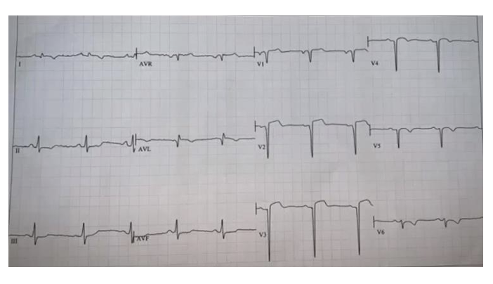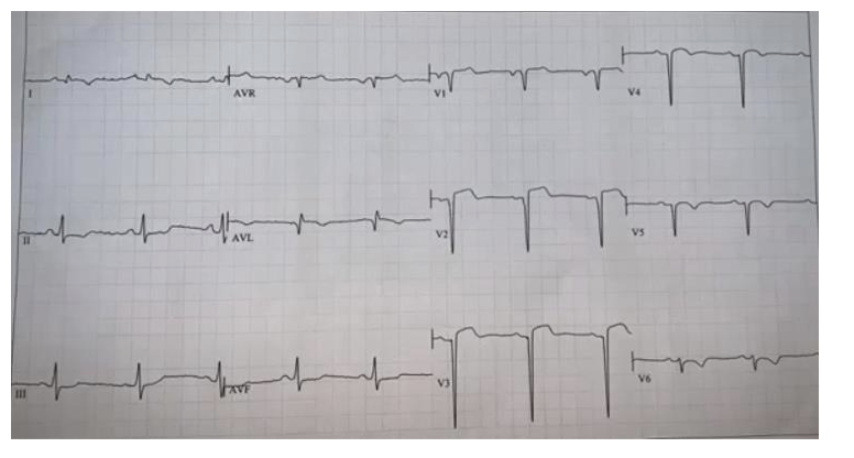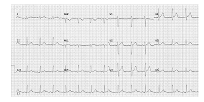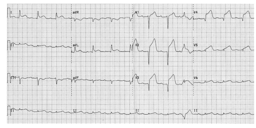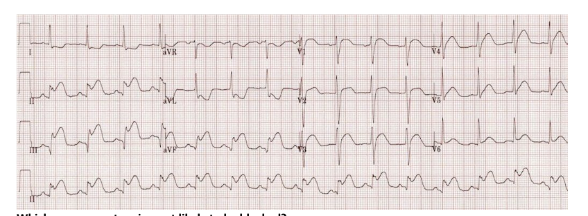 A 75-year-old gentleman with a background of hypertension presents to rapid access chest pain clinic with new onset chest pain. An ECG is performed: