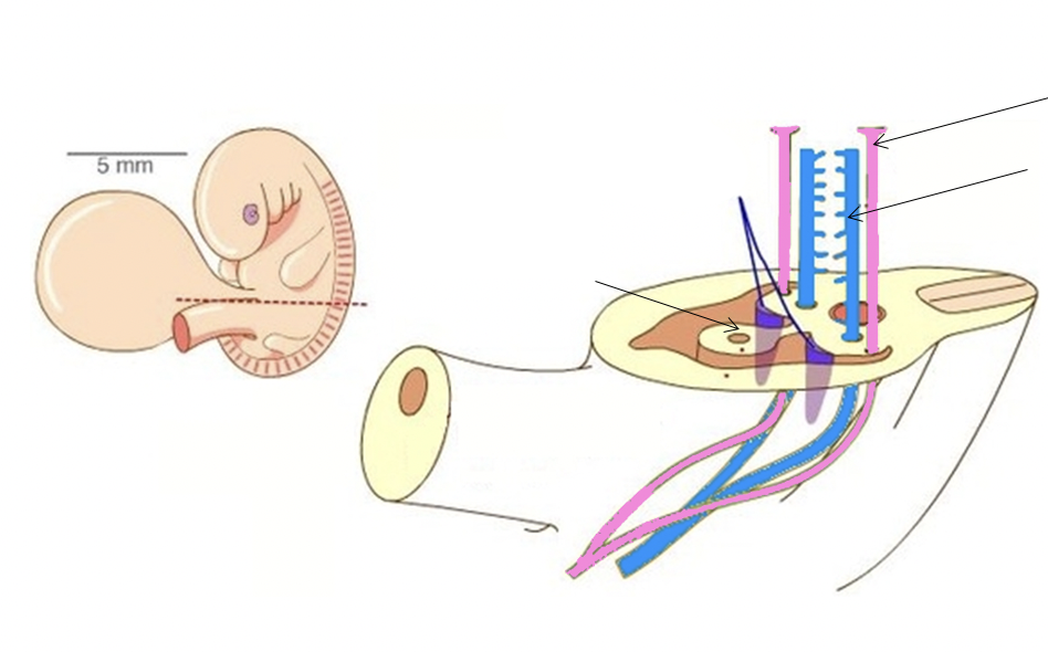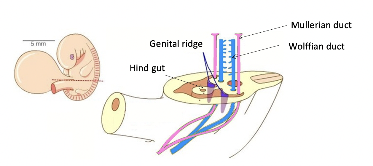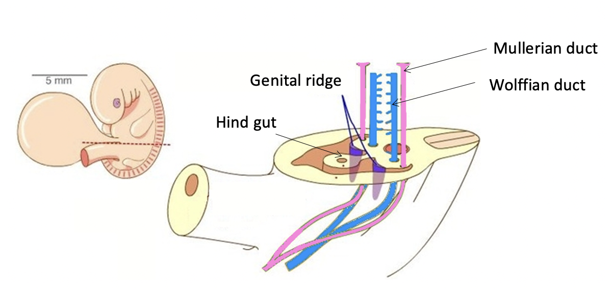 Image shows 3–4-week-old embryo, dotted line is a cross-section, which contains genital ridges.