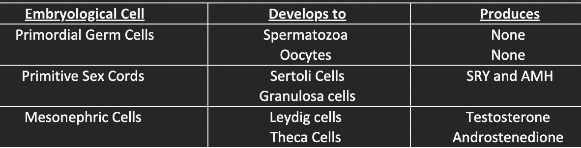 Primitive sex cords: become Sertoli cells of the testis (m), or Granulosa cells of the ovary (f)