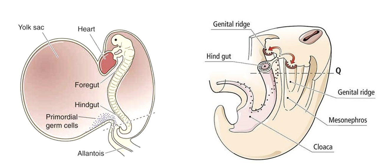 They then migrate to the connective tissue of the hind gut, to the region of the developing kidney and on to the genital ridge – completed by 6 weeks