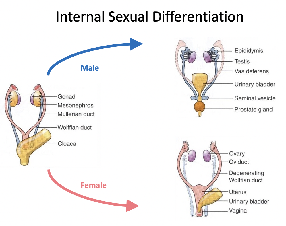 Wolffian (mesonephric) ducts: Stimulated by testosterone. Females dont have testosterone so Wolffian duct degenerates