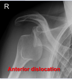 Anterior dislocation is usually caused by a fall with the shoulder in external rotation, causing the humeral head to move forward from the glenoid fossa
