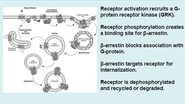 Desensitization - phosphorylation of receptor blocks further activation of receptor, receptors becomes desensitized to signal. GPCR still present on cell surface but it is inactive.