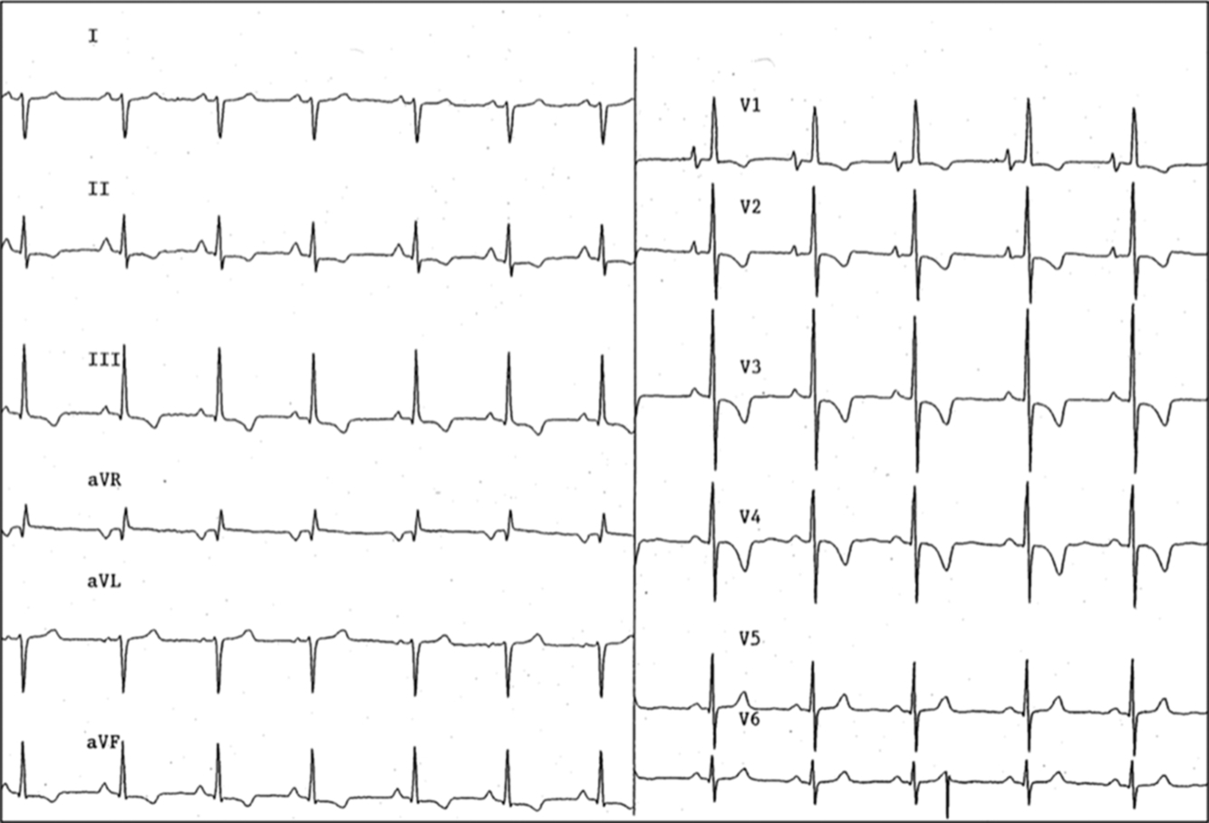Déviation axiale droite, onde R importante en V1 et V2, onde S profonde de V4 à V6.