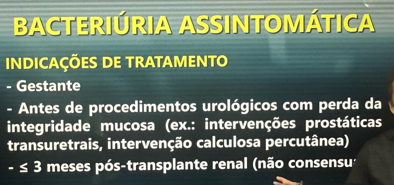 A bacteriúria assintomática só deve ser obrigatoriamente tratada em gestantes e pacientes que serão submetidos a procedimentos urológicos invasivos. Algumas fontes consideram também a necessidade de tratamento em receptores de transplante renal e neutropênicos.