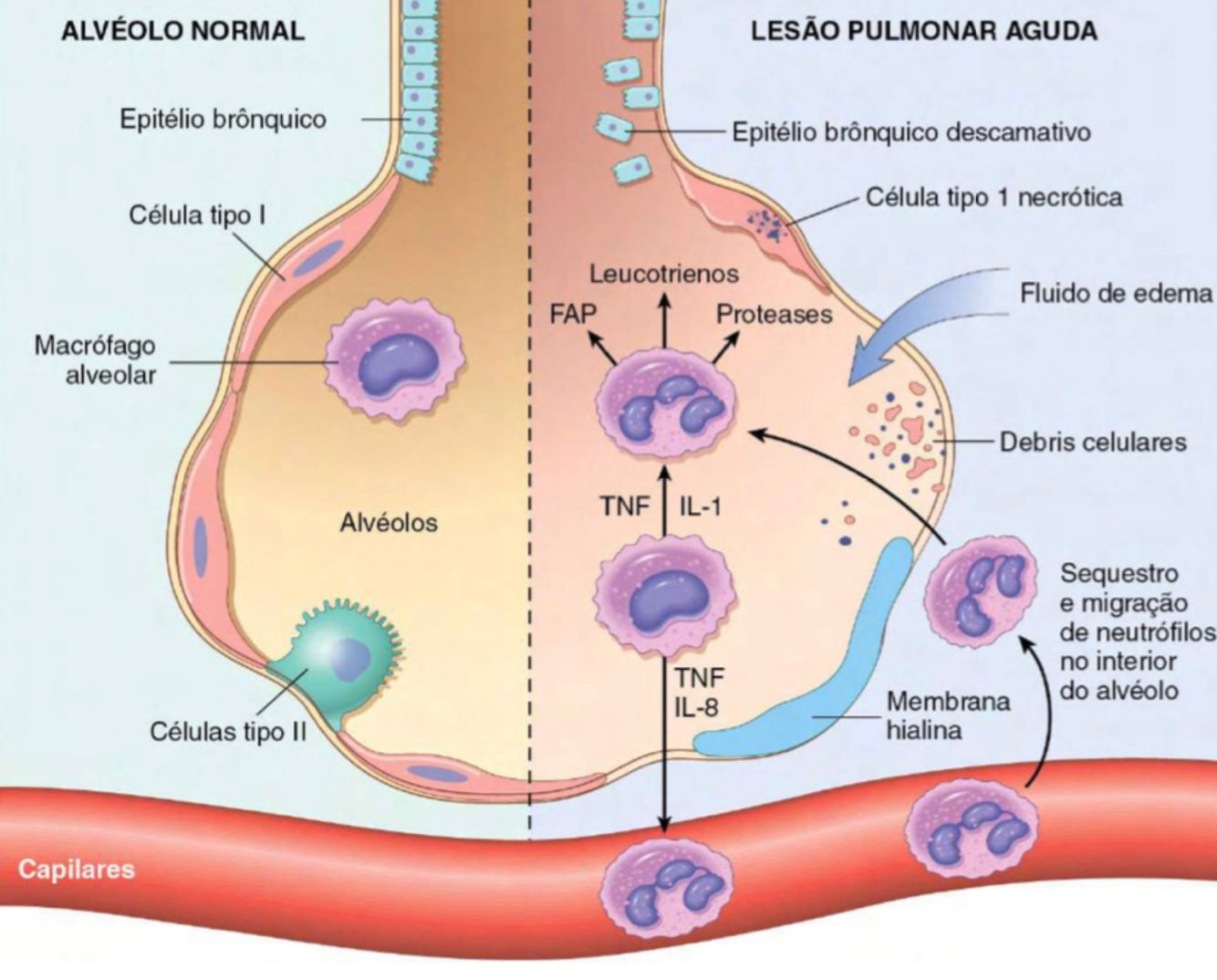 A lesão pulmonar é causada por um desequilíbrio dos mediadores pró e anti-inflamatórios. Após 30 minutos da lesão aguda há aumento na síntese de interleucina 8. Ela ativa o neutrófilo, que libera substancias inflamatórias e perpetua a exsudação e a perda do surfactante.