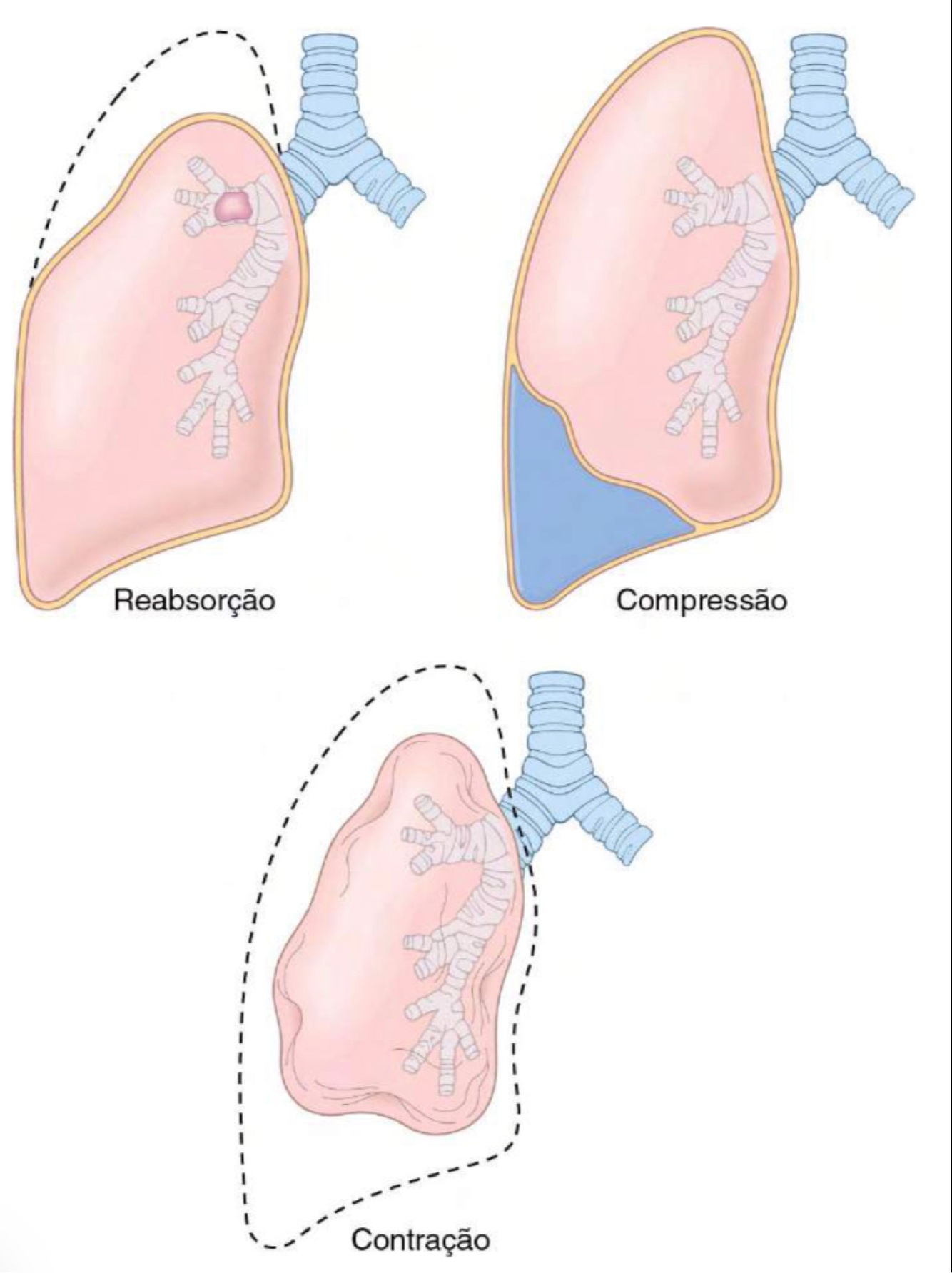 • De reabsorção : ar retido distalmente à oclusão é reabsorvido dos alvéolos não ventilados, fazendo com que as regiões afetadas se tornem totalmente sem gases e, em seguida, colapsem. Causa mais comum é plug mucoso ou mucopurulento.