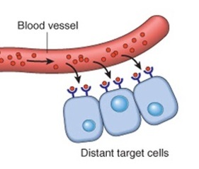 Liberados por glândulas/células especializadas na corrente sanguínea e influenciam células-alvo em outros locais do