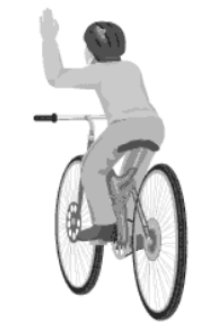 Bicyclists use hand signs to signal turns. If a bicyclist puts their left up in the air, they are signaling that they intend to turn right.
