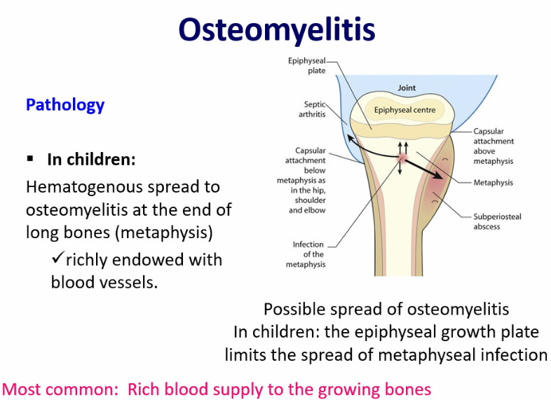 osteomyelitis in children occurs most commonly in long bones and is localized the metaphysis (richly endowed with blood vessels)