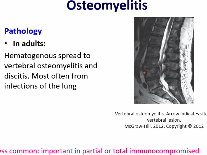 osteomyelitis in adults spreads to vertebral osteomyelitis and discitis and most often occurs from infections of the lung