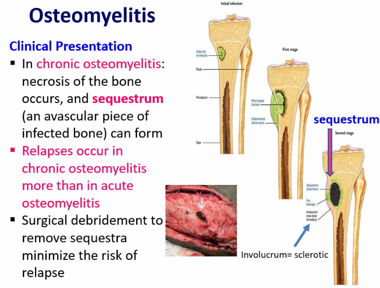 in chronic osteomyelitis, necrosis of the bone occurs and sequestrum (an avascular piece of infected bone) can form