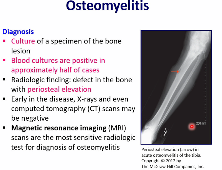 a radiologic finding in osteomyelitis is a defect in the bone with periosteal elevation