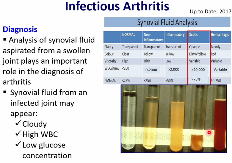 analysis of synovial fluid plays an important role in the diagnosis of infectious arthritis
