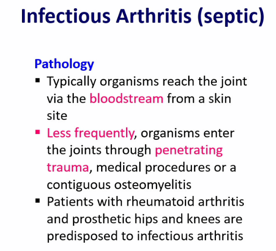 in infectious arthritis, organisms typically reach the joint via the bloodstream from a skin site