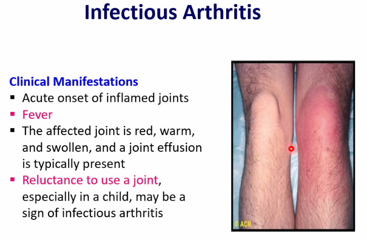 list the clinical manifestations of infectious arthritis