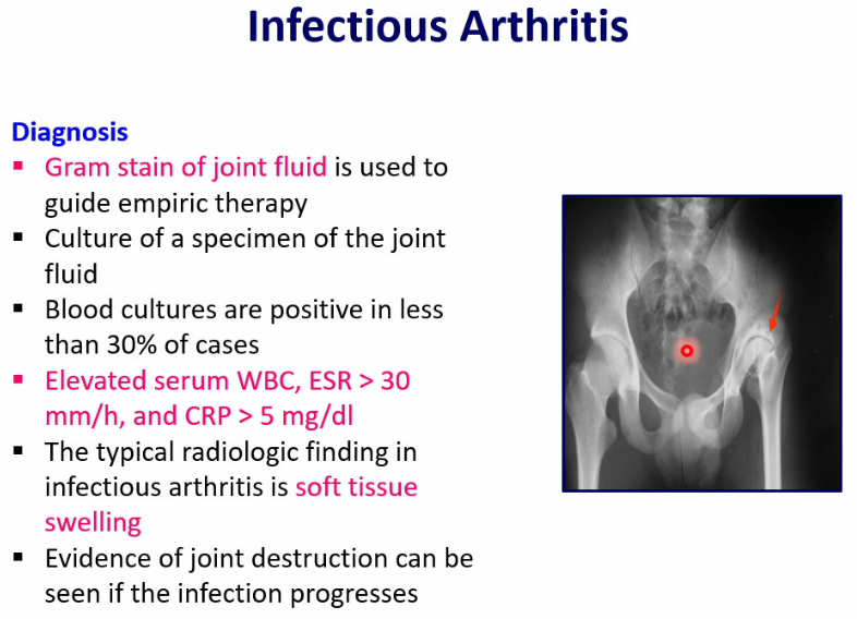 diagnosis of infectious arthritis is via Gram stain of joint fluid