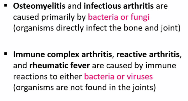 osteomyelitis and infectious arthritis are caused primarily by bacteria (G+ve) or fungi