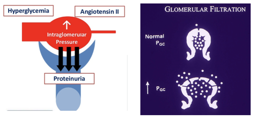 Pathogenic factors involved in diabetic nephropathy are hyperinflation, proteinuria development, intraglomerular hypertension, and mesangial matrix expansion