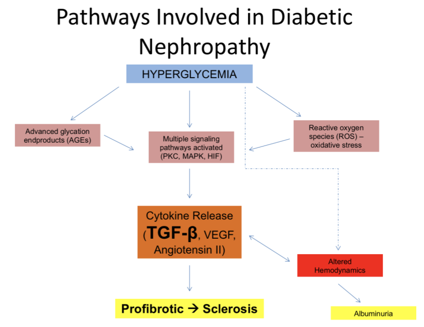 (driven by combo of altered hemodynamics, metabolic stimuli such as hyperglycemia, and genetic predisposition)