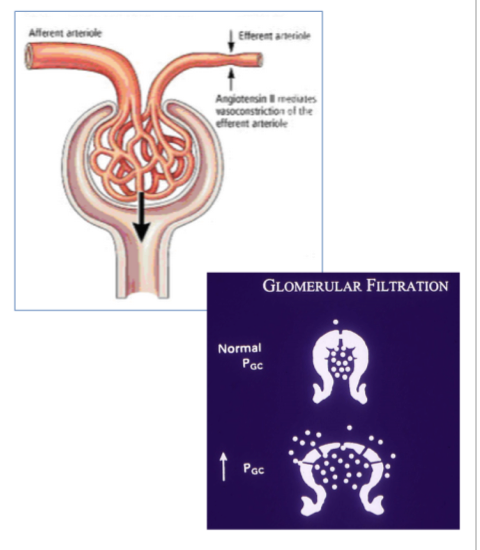 In diabetic nephropathy, intraglomerular hypertension occurs because the afferent arteriole is dilated due to hyperglycemia, and the efferent arteriole is constricted due to angiotensin II