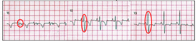 Complexo QRS com baixa voltagem em V1 e súbito aumento nas derivações subsequentes