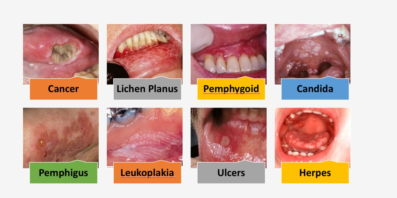 Oral cancer, lichen planus, pemphygoid, candida, leukoplakia, ulcers, herpes