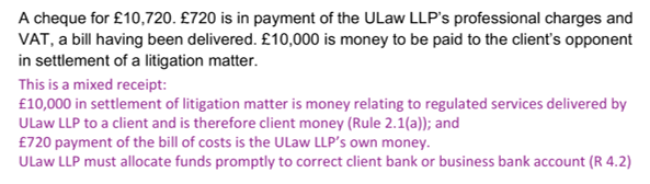 A cheque for £120 from a client in payment of the ULaw LLP’s professional charges and VAT. ULaw LLP has sent a bill
