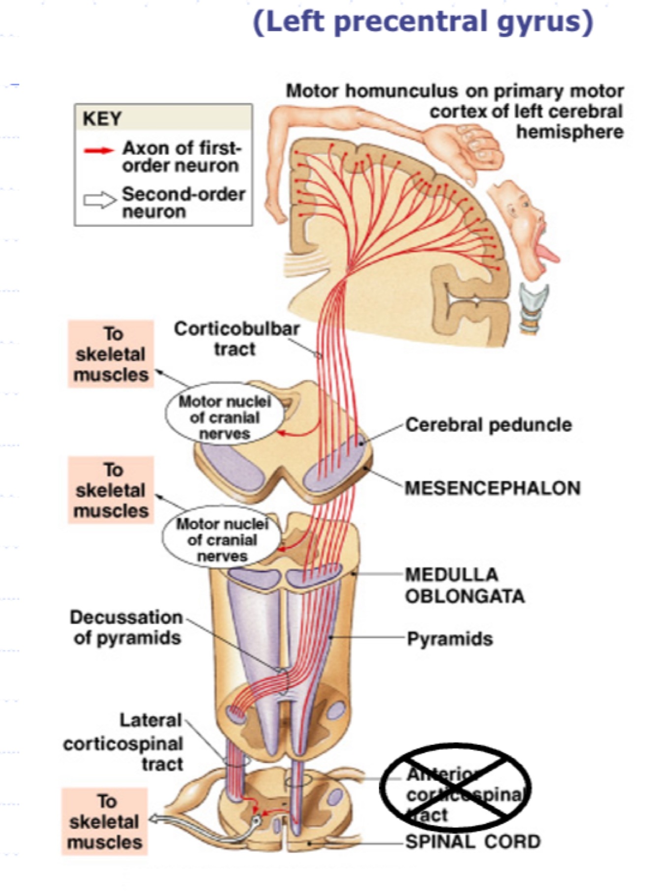 Carries motor impulses from motor cortex to skeletal muscles (voluntary movement)
