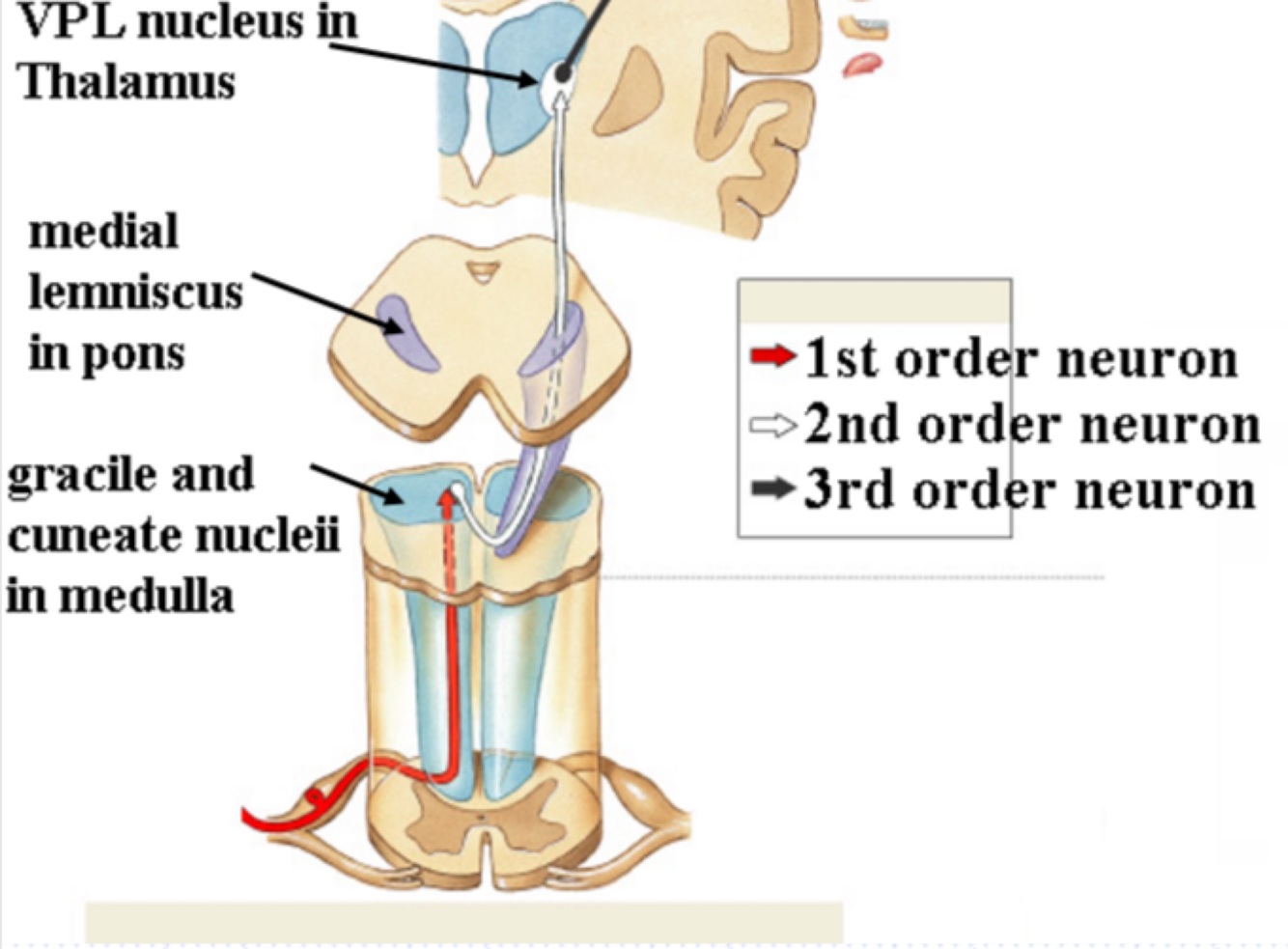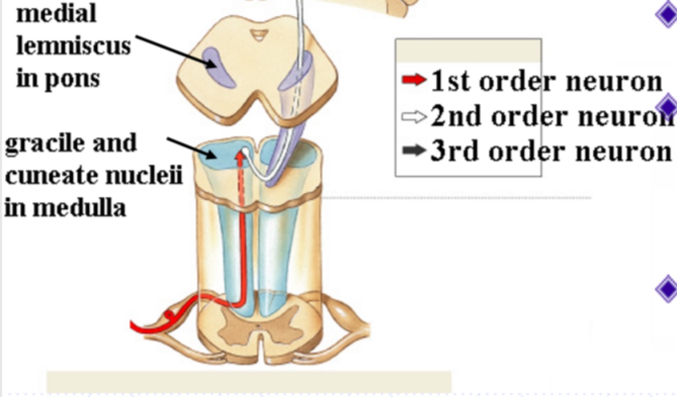1st order neuron picks up information from action potentials and ends by synapsing with the cell body of the 2nd neuron in the lower part of the medulla