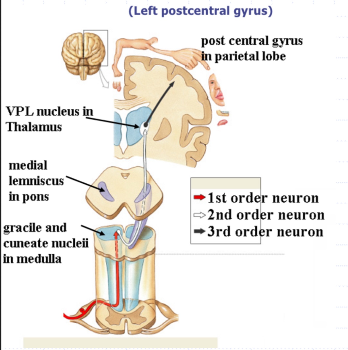 3rd order neuron passes through the IC, radiation to reach the post central gyrus