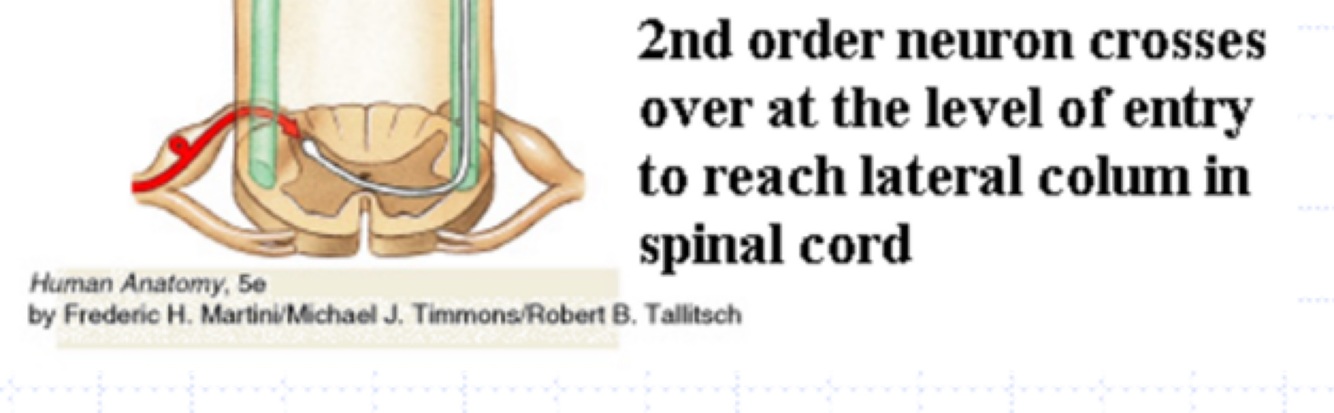 Lateral spinothalamic tract = neurons decussate at the same level they come into the spinal cord