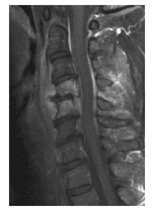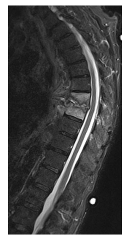 A 54-year-old renal transplant patient presents with back pain, fever, and a new thoracic kyphotic deformity. She is otherwise neurologicallyintact on examination. T2WMRIis shown.