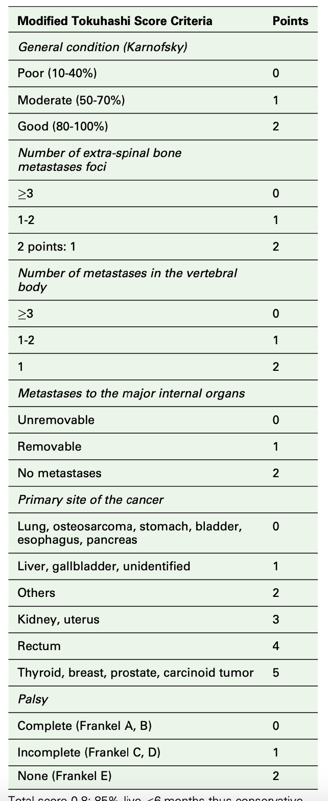 Tokuhashi score for metastatic spine tumor prog- nosis (irrespective of treatment modality).