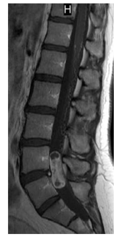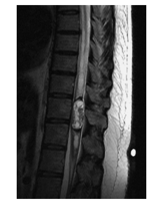 e. A 57-year-old with a past medical history of small cell lung cancer presents with mechanical back pain. On examination he appears kyphotic there is tenderness in the mid-thoracic spine. Neurological examination shows brisk reflexes and extensor plantars in both lower limbs
