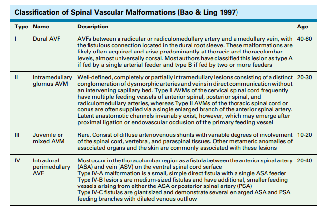 spinal AVMs. These lesions show a male predominance (80-90%) and generally present in late adulthood, ages 40-60. Presentation is generally with radiculomyelopathy, followed by slow but progressive neurological deterioration. Site of pathology in these lesions is within the dural root sleeve, where a direct arteriovenous fistula