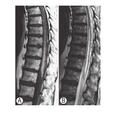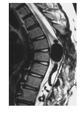 Epidural hematoma can occur secondary to trauma, iatrogenic procedures, or vascular malformation or sometimes can be seen as a spontaneous occurrence, such as in patients with coagulopathy. Spinal extradural haematoma (EDH) is seen to occur most commonly in the thoracic and lumbar region in adults, whereas in children, it is seen to occur in the cervicothoracic region. The dorsal aspect of the canalis themost common site for an epidural hematoma. Most spinal EDHs have a venous source of hemorrhage. Spinal hemorrhage (epidural, subdural or subarachnoid) presents with intense, stabbing pain at the location of the hemorrhage (“coup de poignard of Michon”) that may be followed in some cases by a pain-free interval of minutes to days, after which there is progressive paralysis below the affected spinal level. CT scan will demonstrate lentiform or biconvex hyperdense collection with variable cord compression. MR will demonstrate a lentiform collection in the epidural compartment, the signalintensity ofwhichwill vary with the age of the hemorrhage (Fat-suppressed T1WI can be used to distinguish blood from fat).