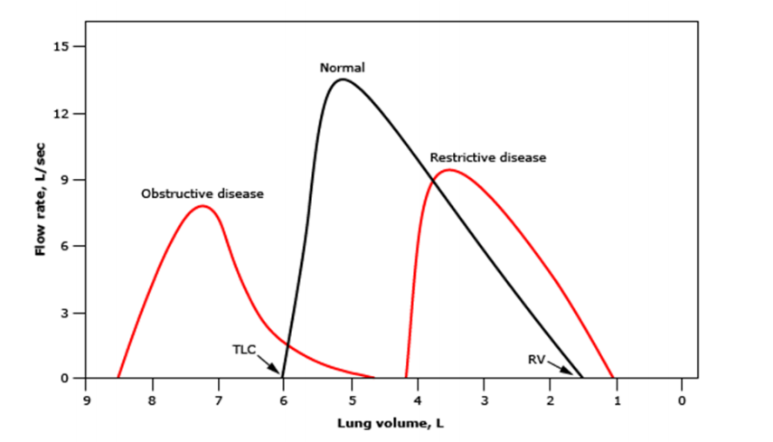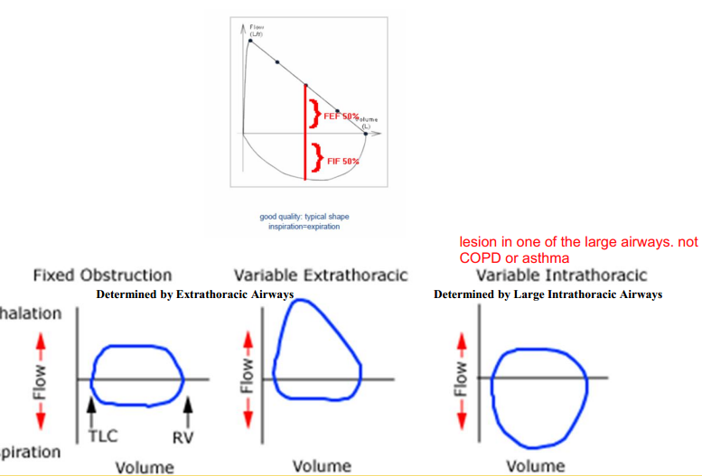 Asthma/issues in the smaller airways. remember the table of airway resistance versus lung volume? Peak at maximal lung volume then dropping w expiration and smaller lung volumes.
