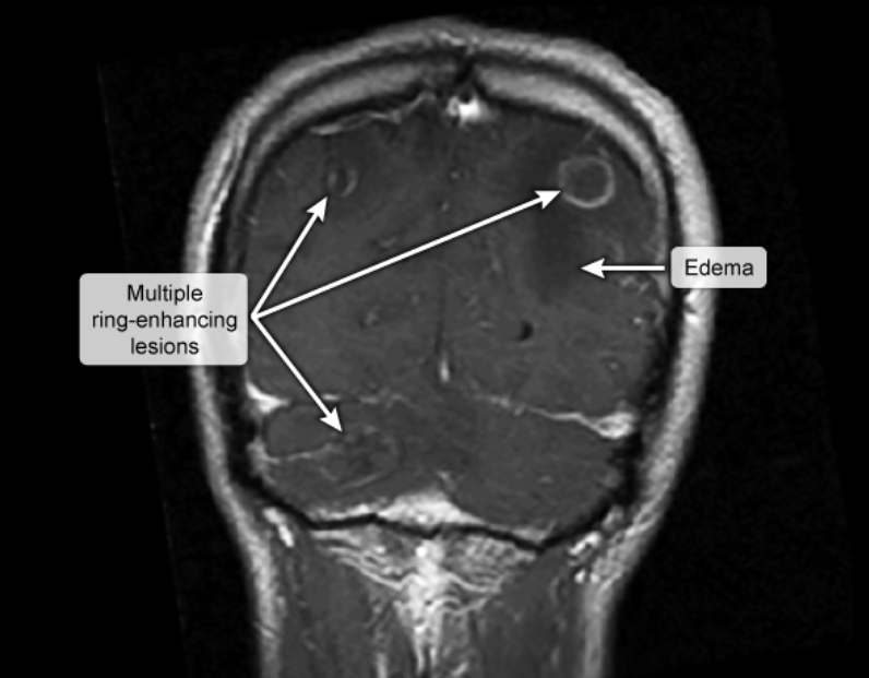 Multiple ring enhancing lesions should raise supsicion for….