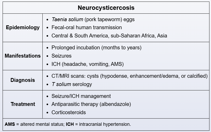Neurocystercosis: pork tapeworm (Taenia solium) which is endemic to developing countries. Presents with adult onset seizure and evidence of at least one or more cystsin the brain parenchyma. Tx with corticosteroids and albendazole.