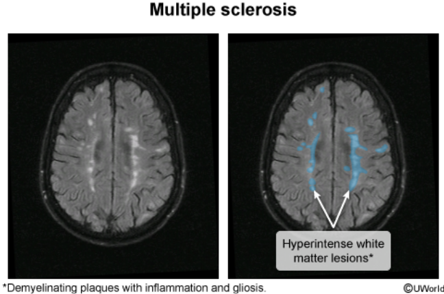 Multiple scattered ovoid lesions in the periventricular regions and spinal cord