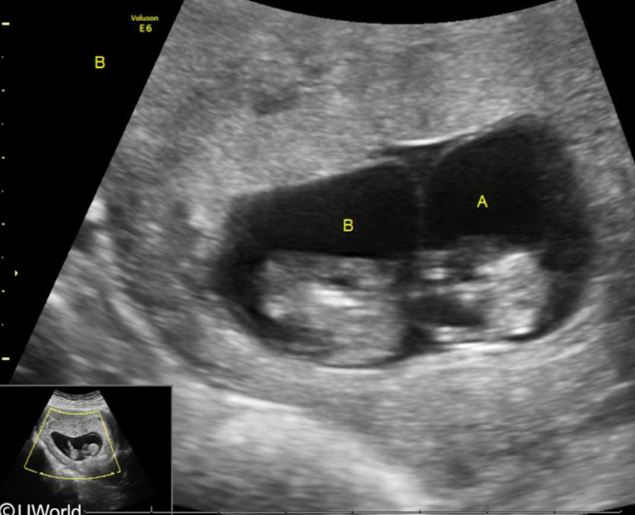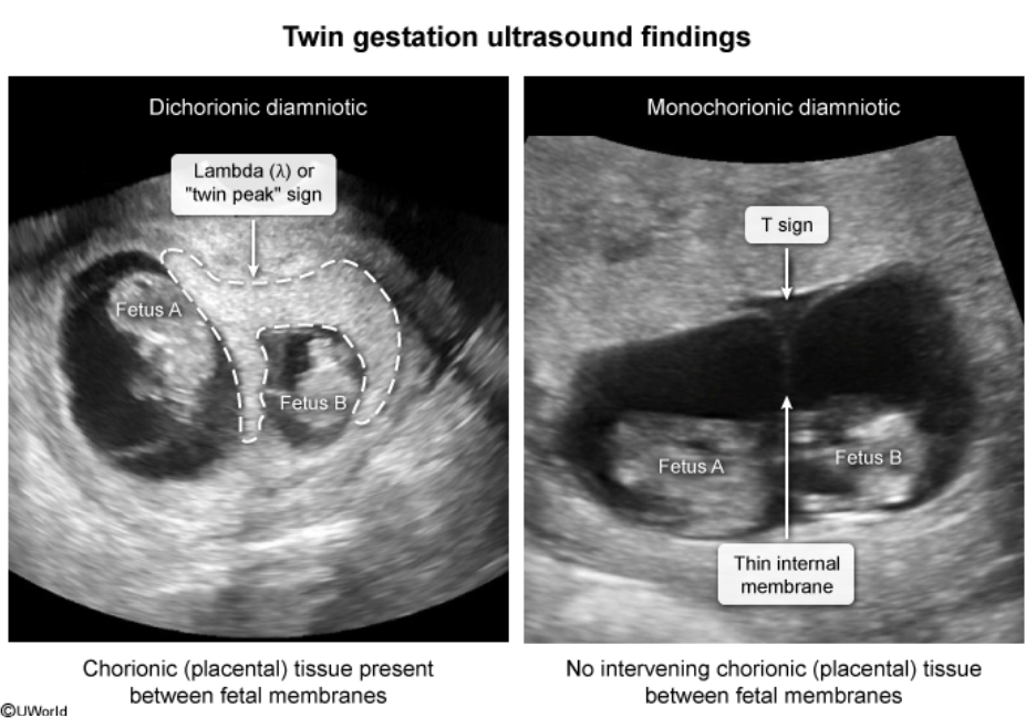 Monochorionic diamniotic twins (1 placenta, 2 amniotic sacs)